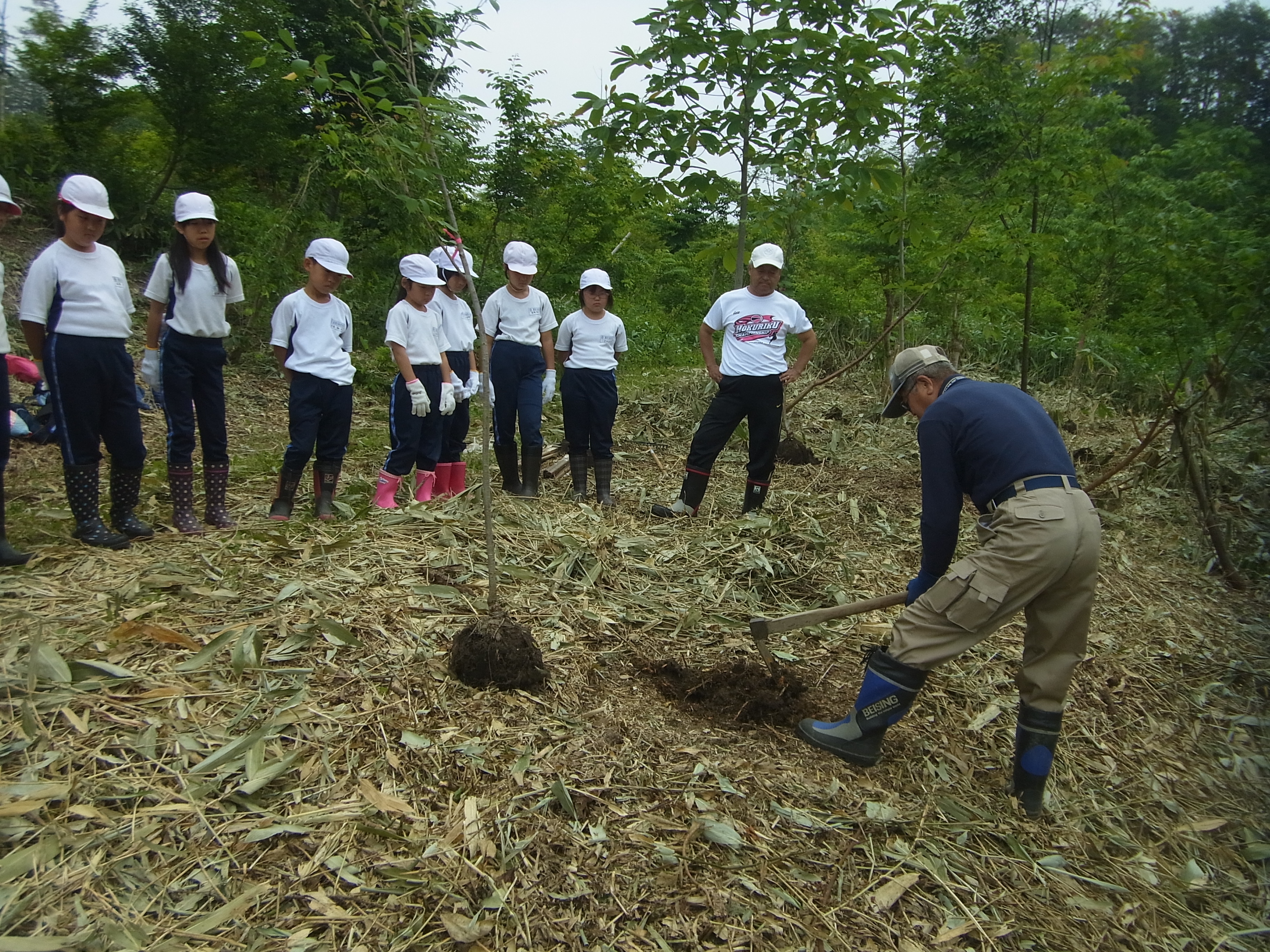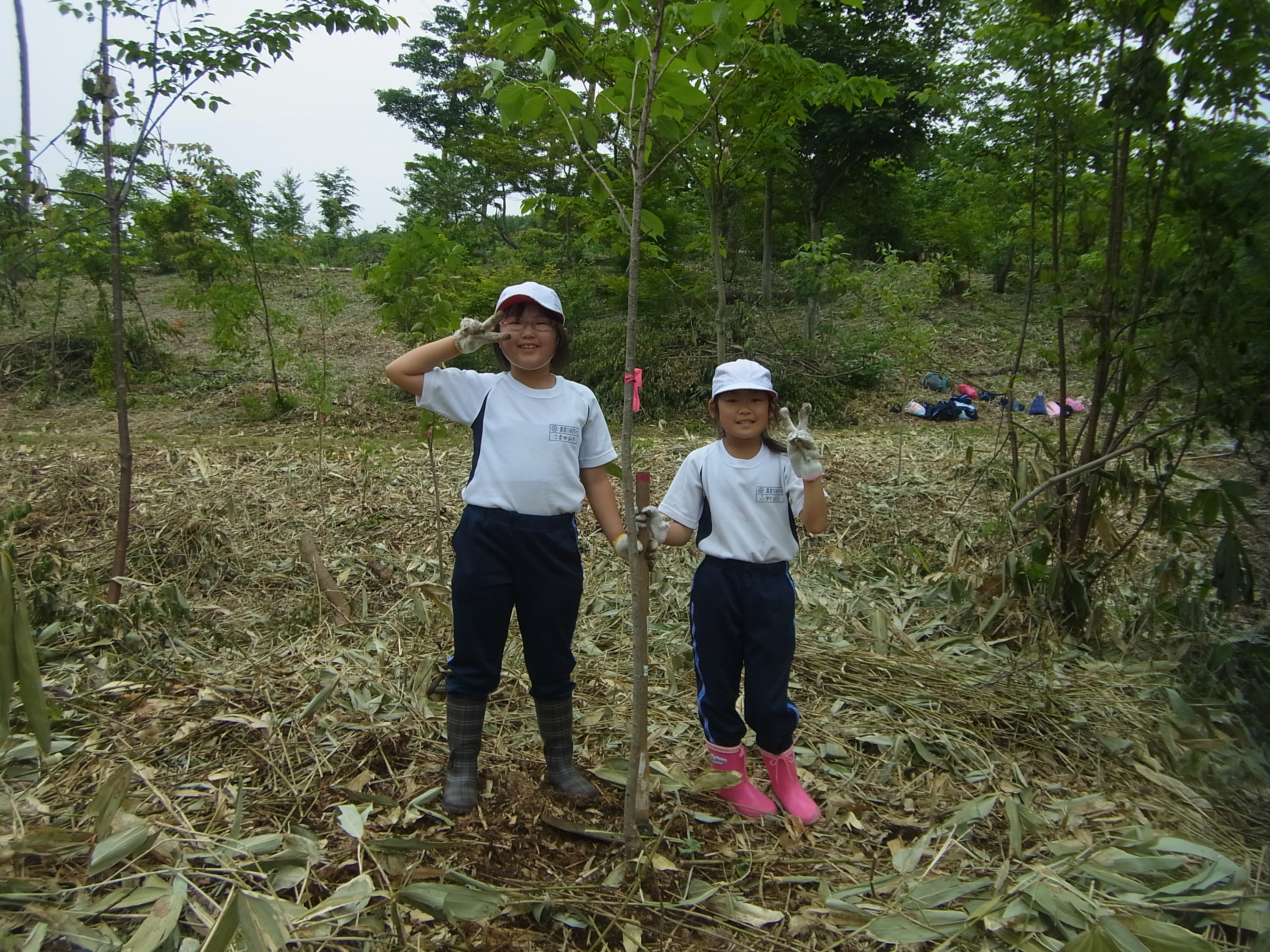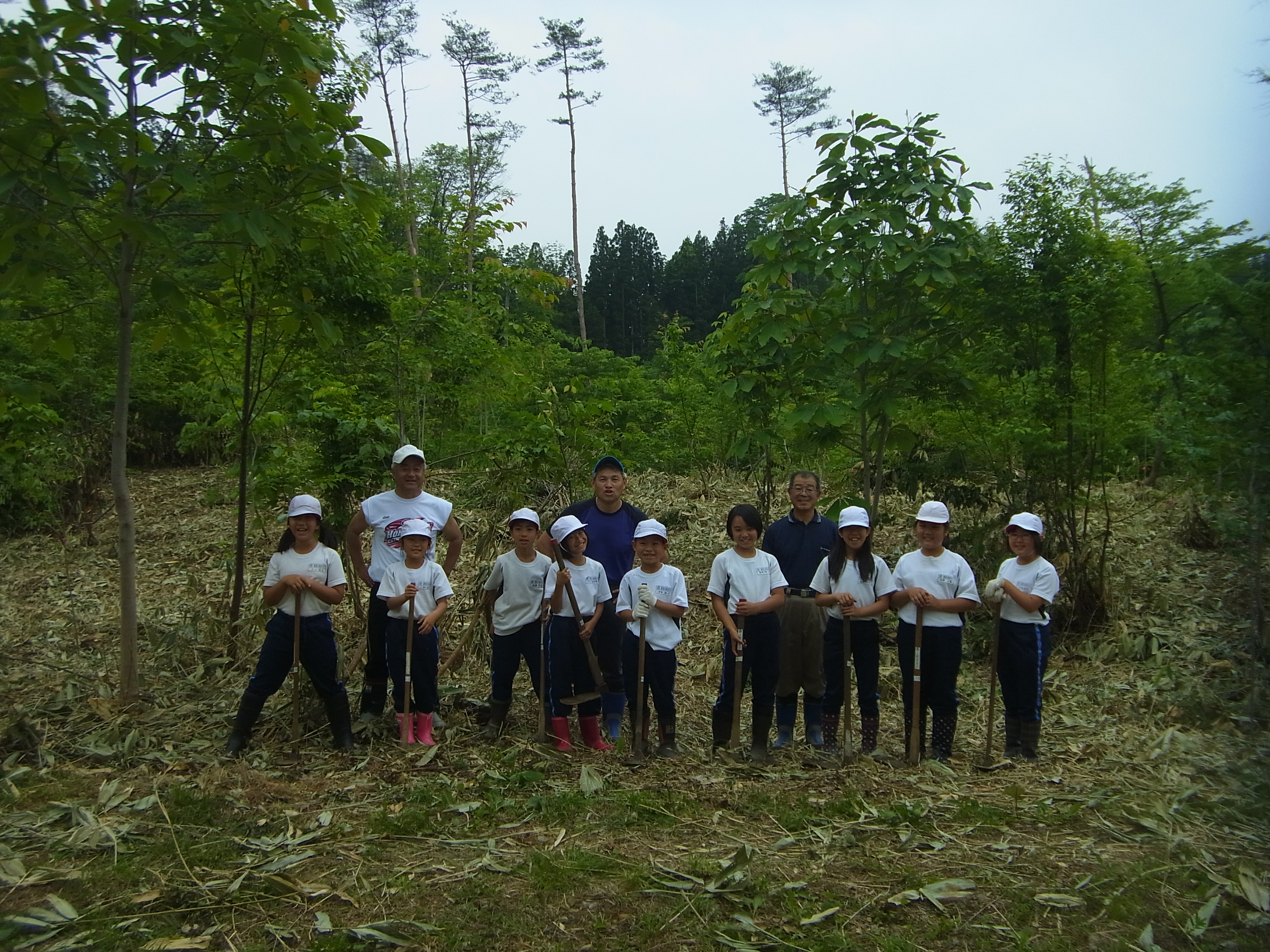 6月3日(水)あさひ小学校(4年生)児童9名と先生2名、桜の植樹体験をして頂きました。 バスを降り、歩いて植樹現場まで移動。 まずは、「ご挨拶」。 植樹の作業説明。 2人1組で植樹作業。 先生も児童と一緒に植樹体験。 植樹後は「ハイ、ピース」パチリ。 みんなで記念写真。 終わりに、私たちにとっていかに木が重要な役割をしているかを話しをして頂いた。
