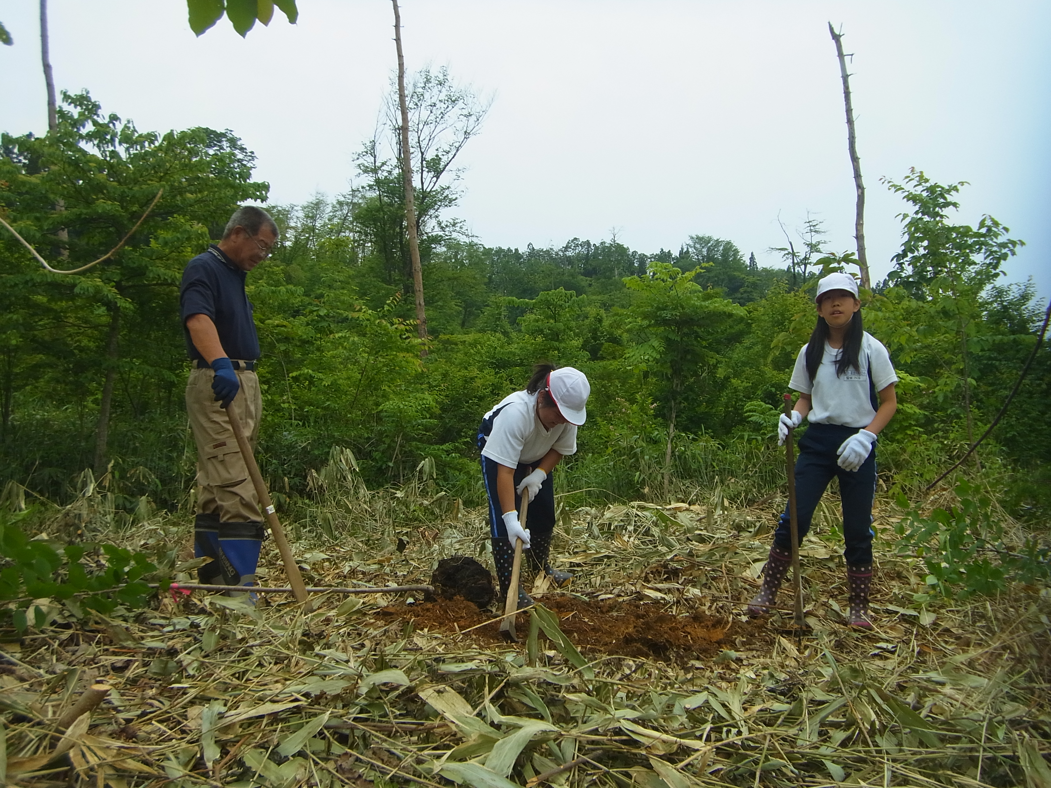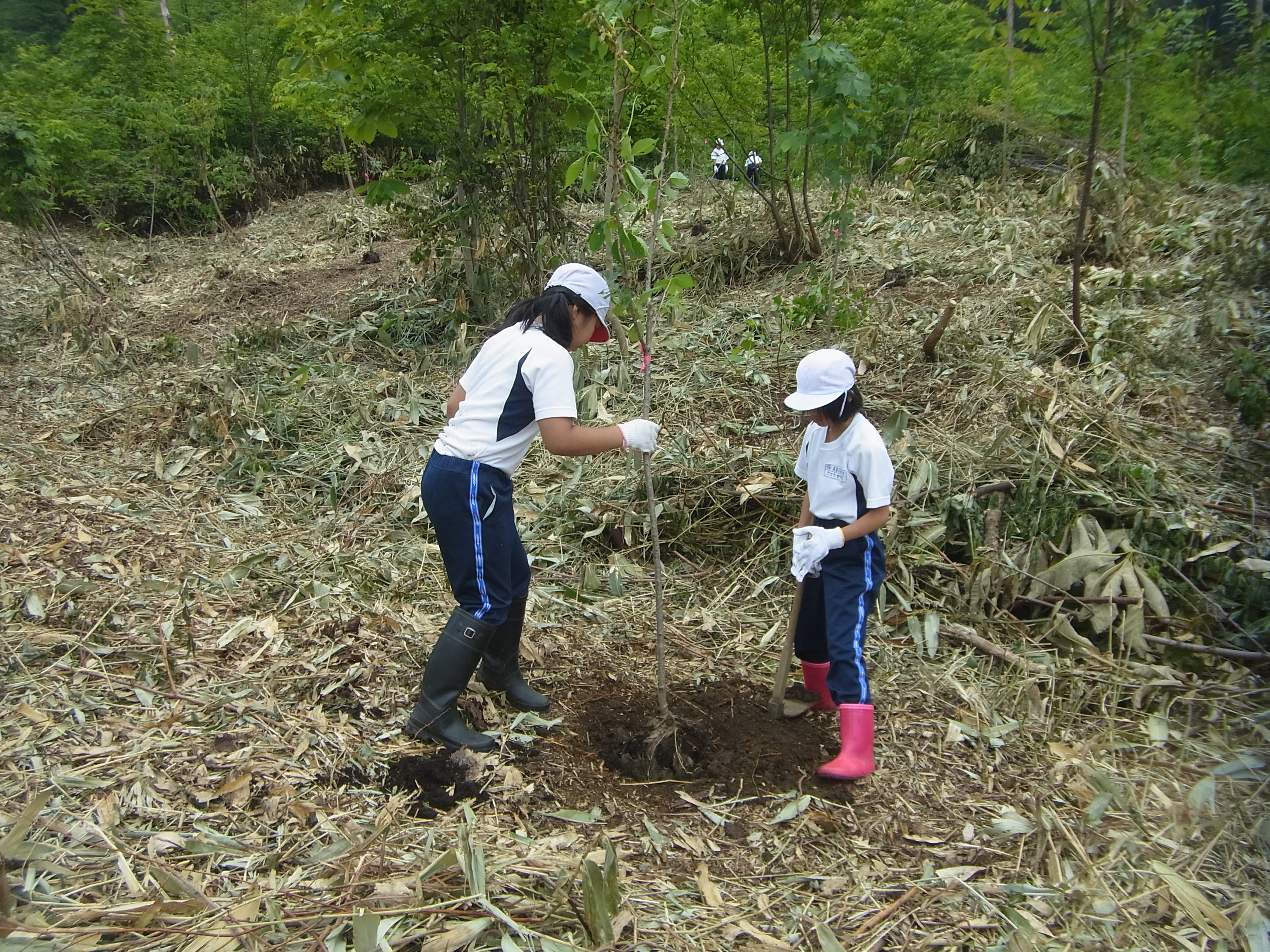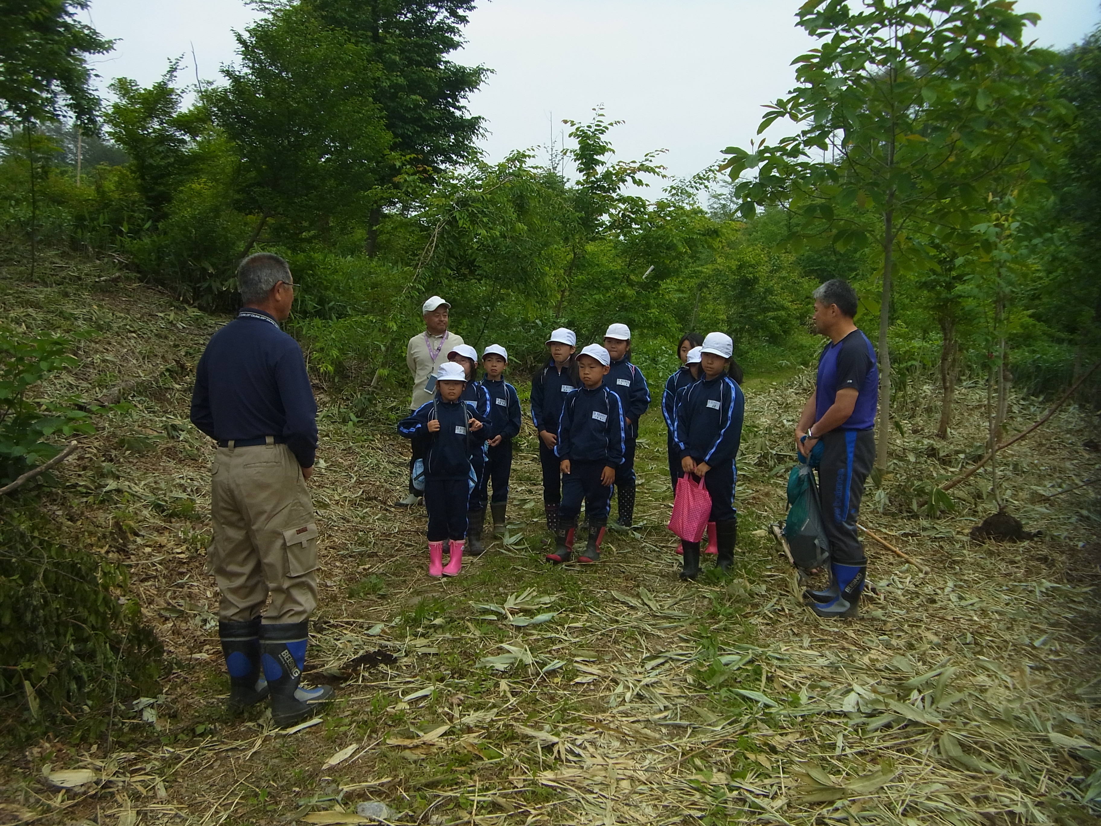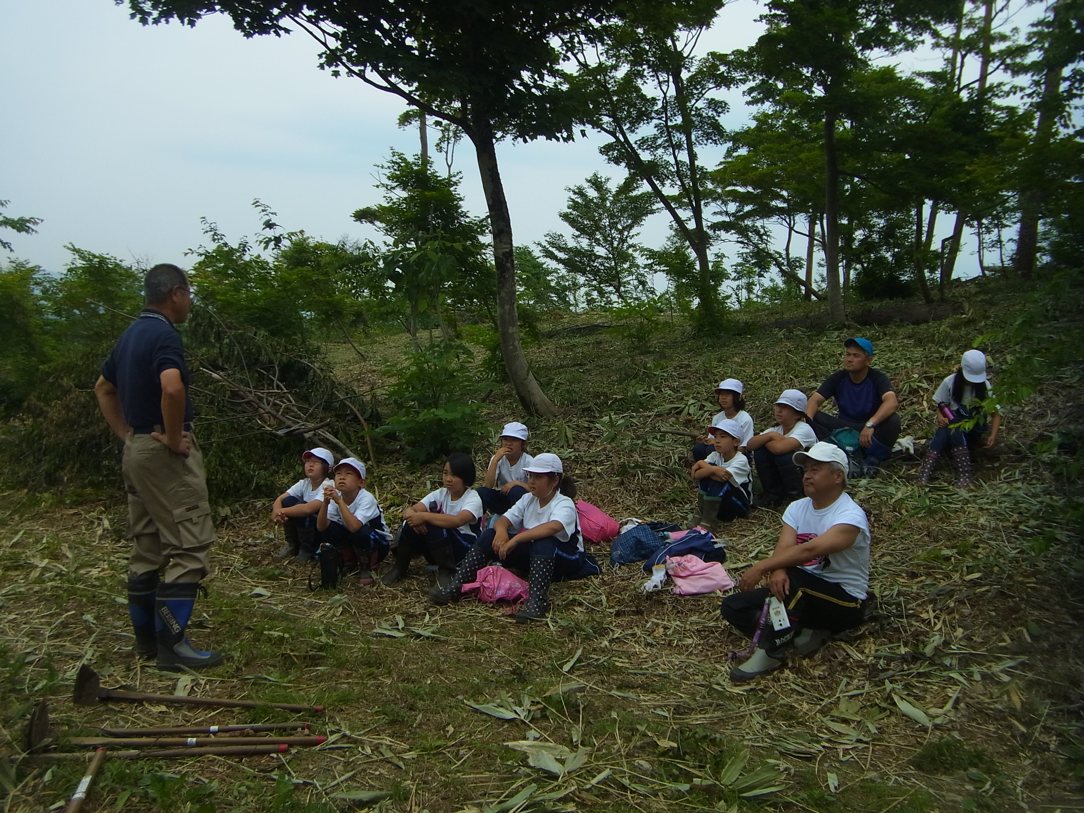 6月3日(水)あさひ小学校(4年生)児童9名と先生2名、桜の植樹体験をして頂きました。 バスを降り、歩いて植樹現場まで移動。 まずは、「ご挨拶」。 植樹の作業説明。 2人1組で植樹作業。 先生も児童と一緒に植樹体験。 植樹後は「ハイ、ピース」パチリ。 みんなで記念写真。 終わりに、私たちにとっていかに木が重要な役割をしているかを話しをして頂いた。