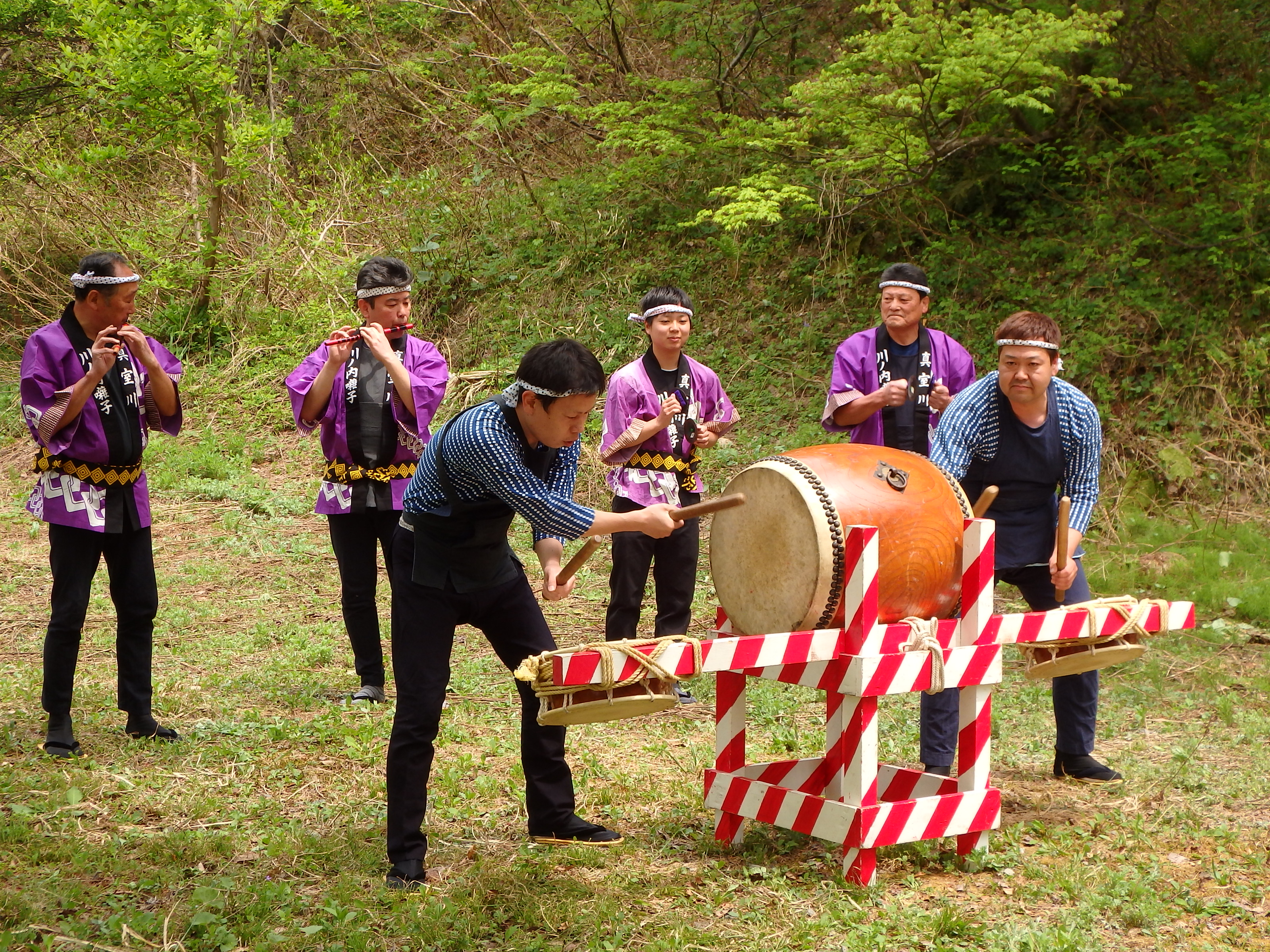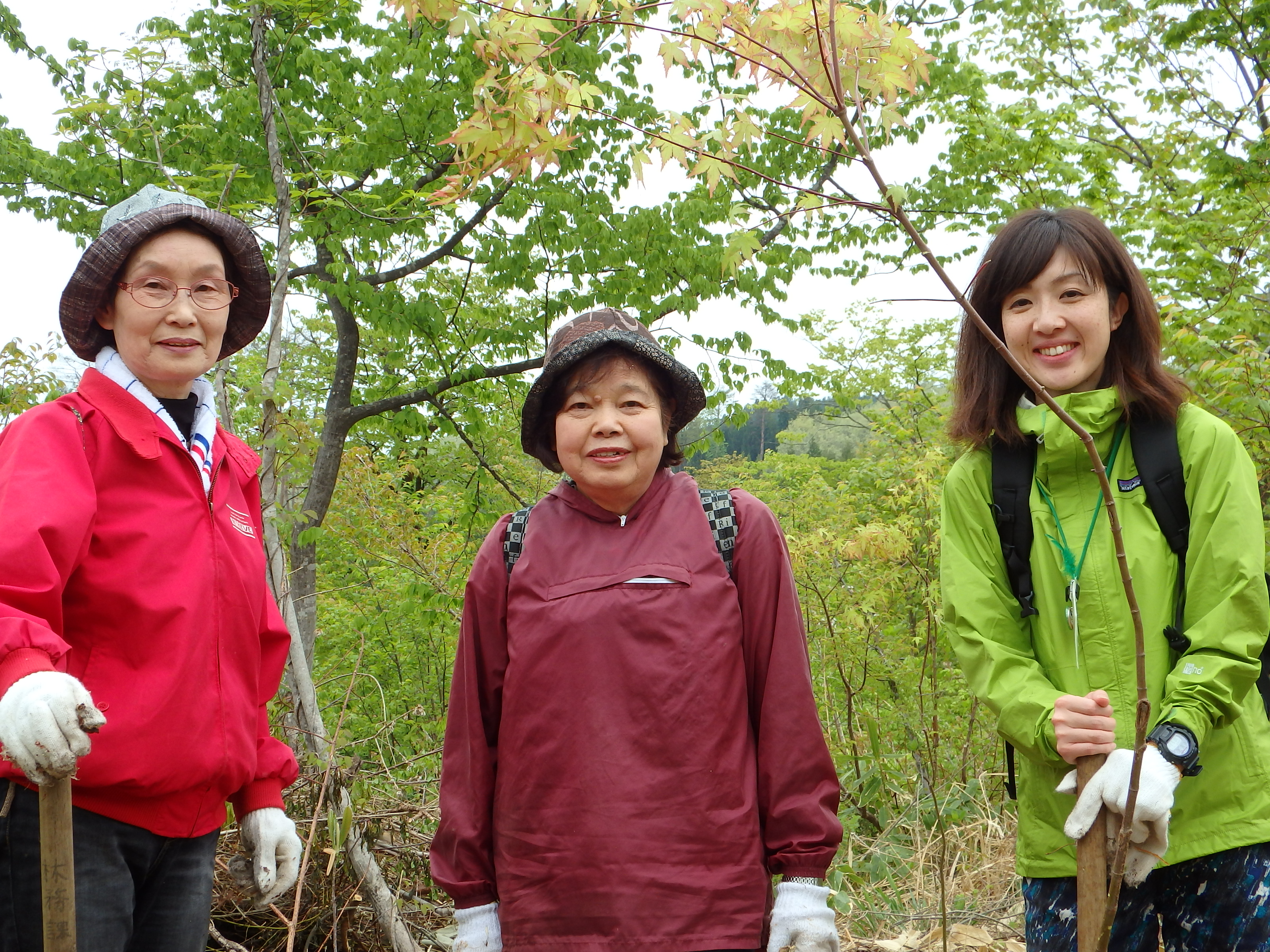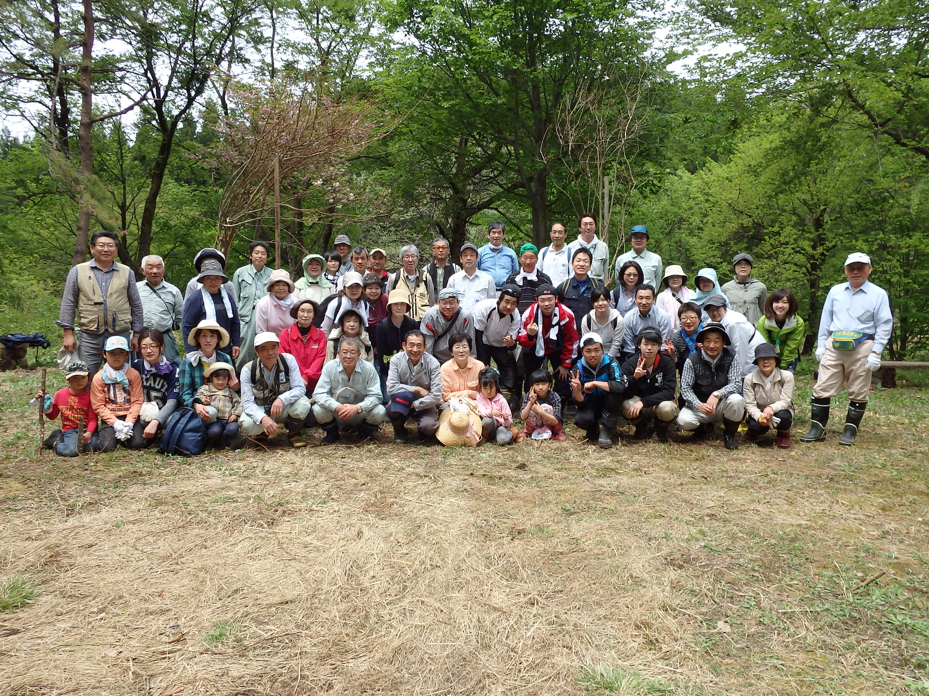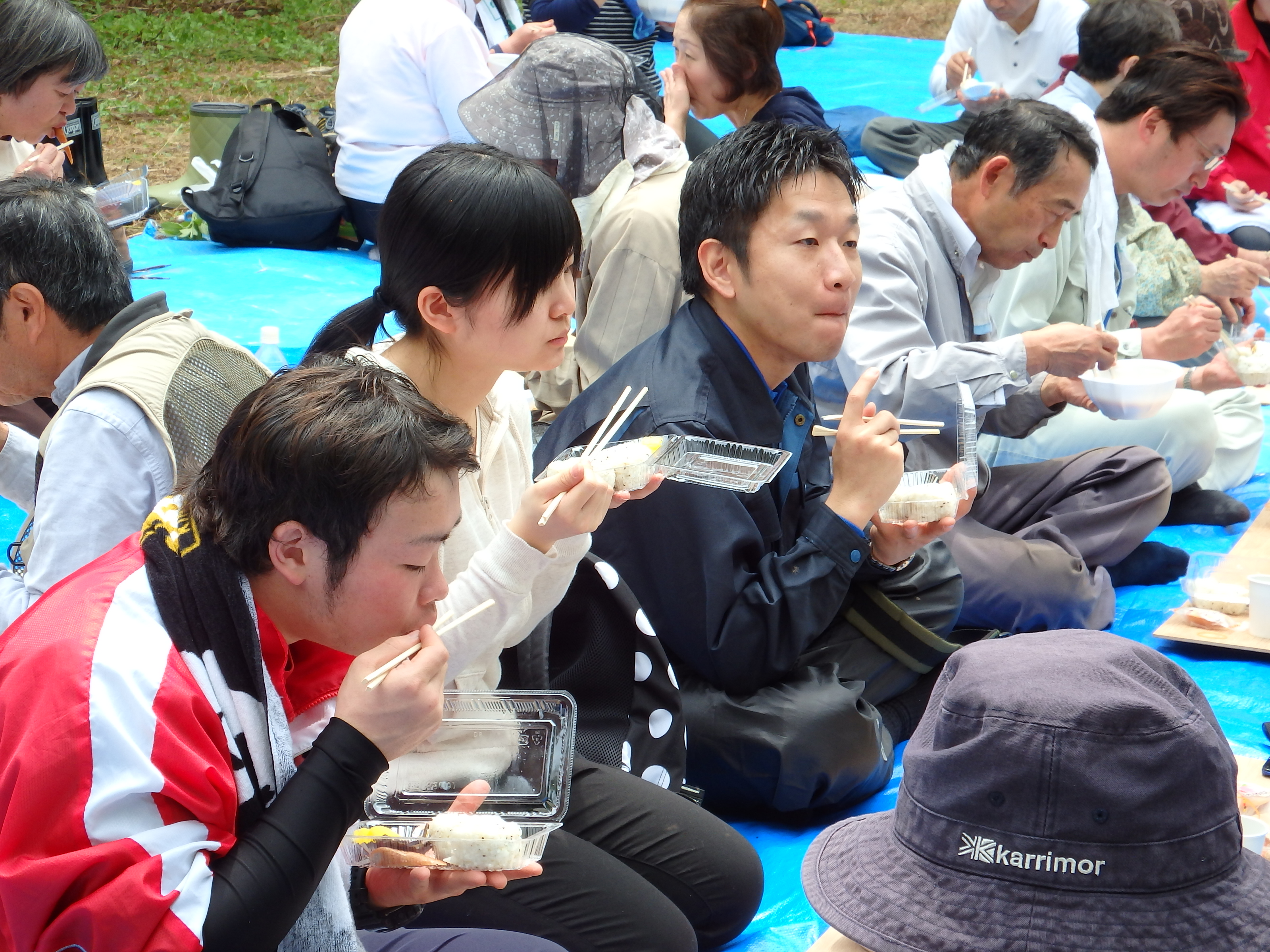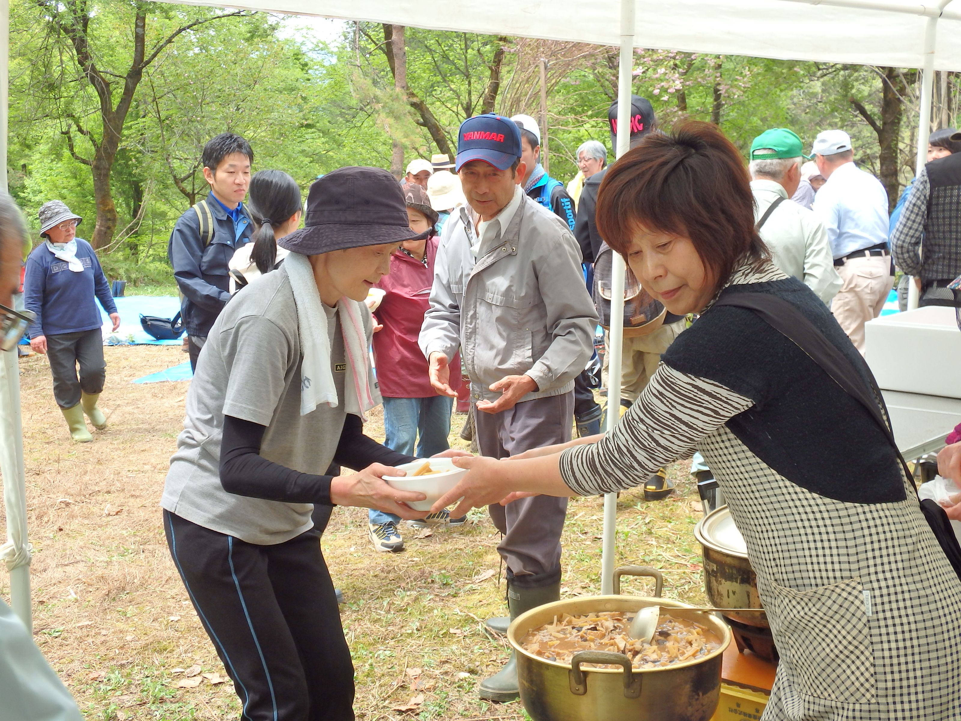 当日は天候に恵まれ、植樹場所までの高低差約20mを、バケツリレーならぬ、植樹木リレーをしてもらい、「良い思い出が出来た」と喜んでもらいました。 植樹をしている姿は、活き活きしてみんないい笑顔でした。 昼食時は、川の内囃子を聞きながら、孟宗汁とおにぎり弁当、日東ベスト(株)様から提供して頂いたウインナーソーセージ、スイーツを喜んで頂きました。